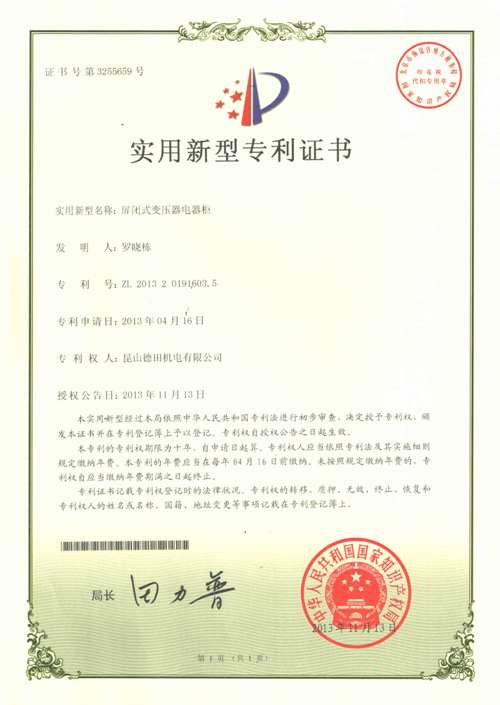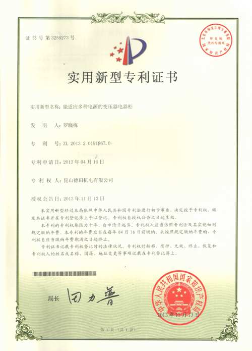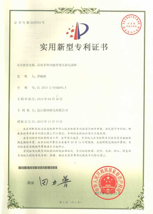 我公司秉乘创新的精神,经我公司研发部门人员不断研究努力之下,于2013年4月研发出实用新型的变压器电器柜,并同时向国家知识产权局申请专利.